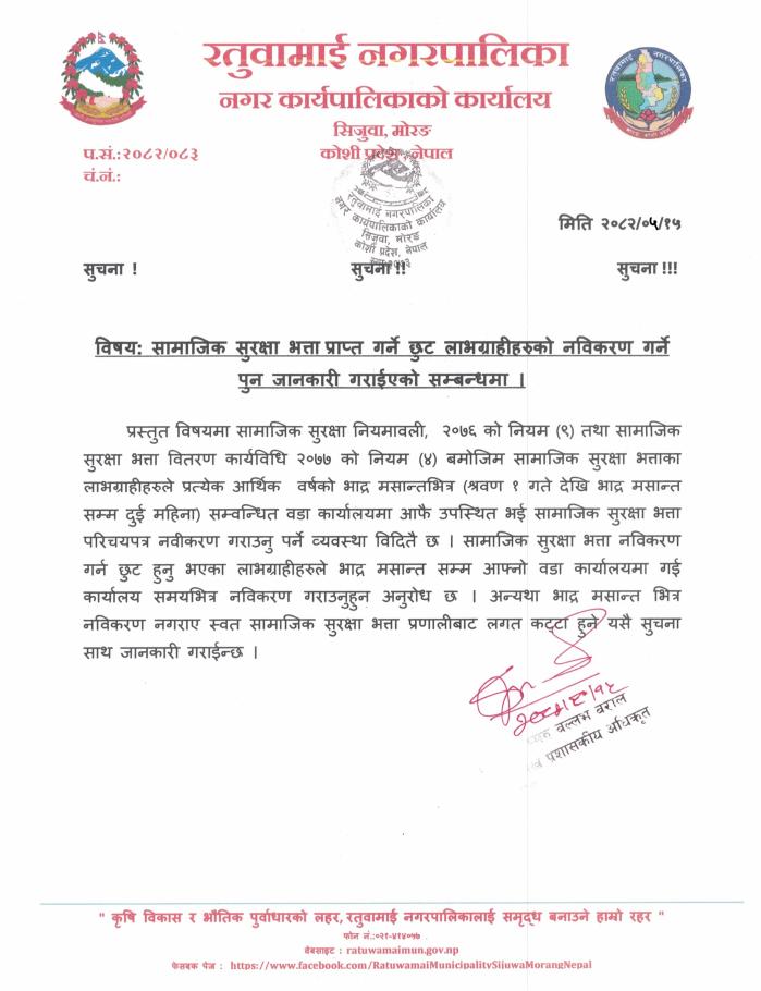 सामाजिक सुरक्षा भत्ता प्राप्त गर्ने लाभग्राहीहरु कोही नवीकरण गर्न छुट भए यहीं भाद्र मसान्त भित्र सम्वन्धित वडा कार्यालयमा आफै उपस्थित भई नवीकरण गराउने सम्वन्धी सूचना !