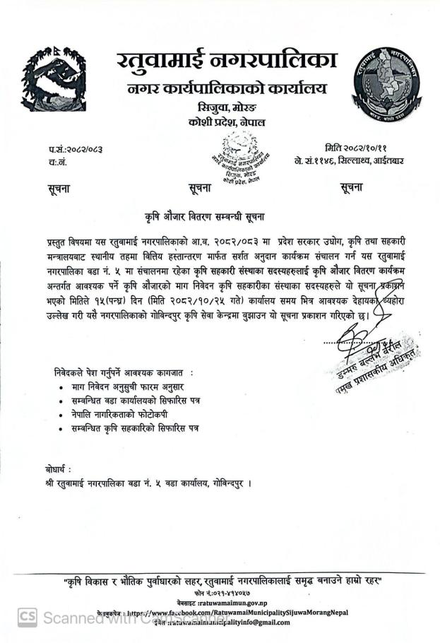कृषि औजार वितरण सम्बन्धि सूचना ।