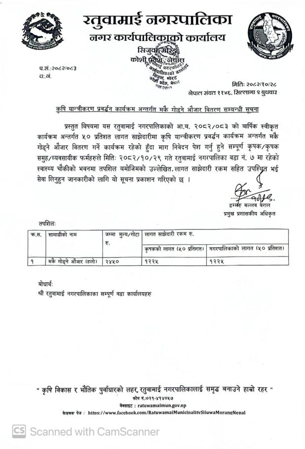 कृषि यान्त्रिकरण प्रवर्द्धन कार्यक्रम अन्तर्गत मकै गोड्ने औजार वितरण सम्वन्धि सूचना !