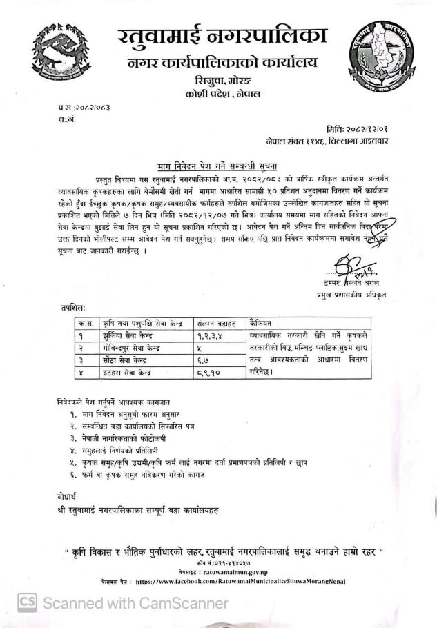कृषि शाखाको माग निवेदन पेश गर्ने सम्बन्धि सूचना l