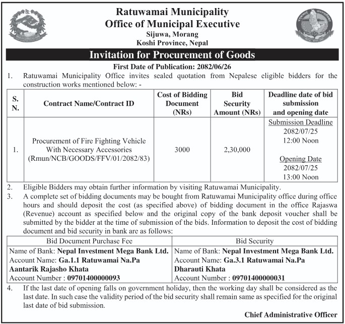» दमकल खरिदका लागि विद्युतीय बोलपत्र आह्वानको सूचना । (Procurement of Firefighter vehicle)