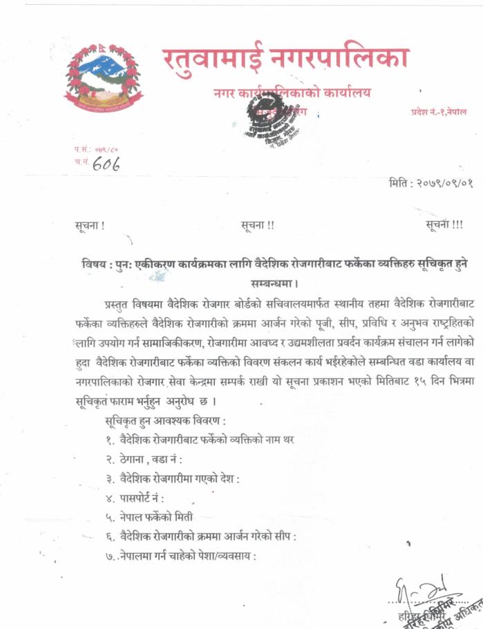 बैदेशिक रोजगारबाट फर्किने व्यक्तिहरुले सुचिकृत गराउने बारी सूचना !