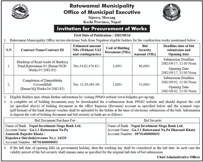 » विद्युतीय बोलपत्र आव्हानको सूचना ! (Blacktop Of Jhurkiya Pond side Road and Completion of Damravitta Covered Hall)